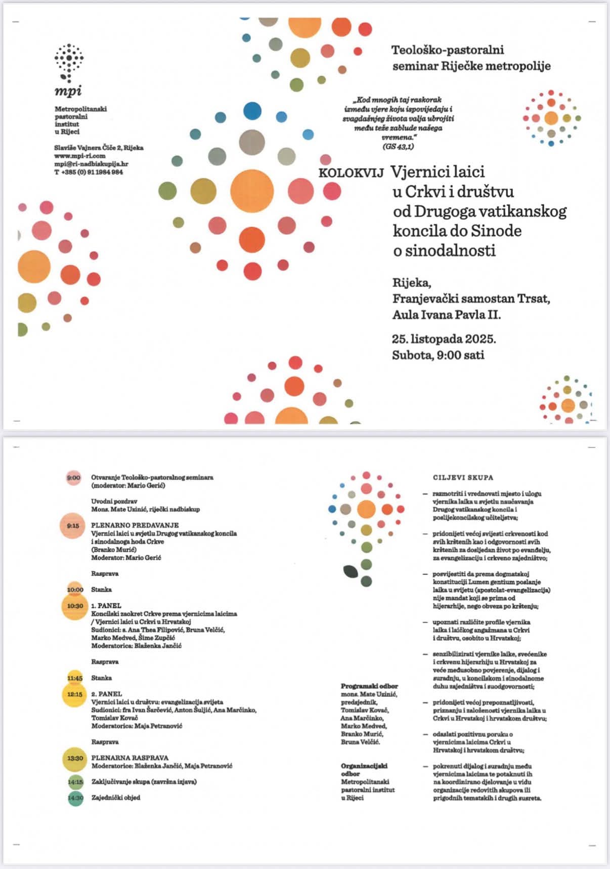 „Ove godine imamo puno razloga za slavlje različitih jubileja. Za nas u Rijeci najvažniji je 100. godišnjica od utemeljena biskupije u gradu Rijeci, za sve kršćane je to Prvi ekumenski sabor u Niceji, a za nas katolike to je 60. obljetnica završetka Drugog vatikanskog sabora. Jedan od plodova Koncila je i svijest o suodgovornosti svih u životu i poslanju Crkve. Koliko smo doista svjesni toga 60 godina poslije? Ne znam odgovor na to pitanje, ali vjerujem da ćemo ga ovim kolokvijem uspjeti donekle otkriti“, poručio je riječki nadbiskup i metropolit Mate Uzinić danas 25. listopada molitvom otvarajući Teološko-pastoralni seminar Riječke metropolije posvećen temi Vjernici laici u Crkvi i društvu 21. stoljeća – od Drugog vatikanskog koncila do Sinode o sinodalnosti.