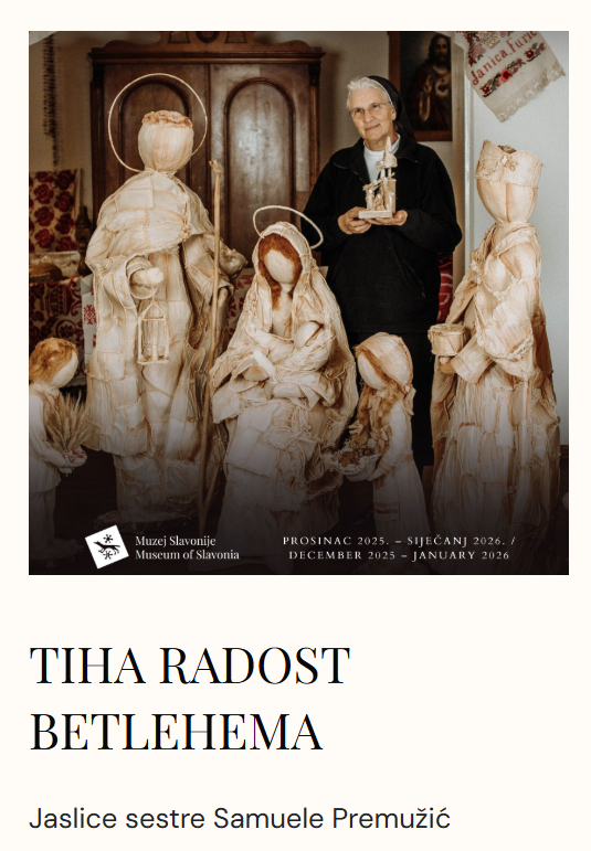 U vrijeme došašća, Muzej Slavonije otvara vrata svjetlosti i zajedništva. Jaslice sestre Samuele poziv su na tišinu, promišljanje i radost Božića. Jedinstven betlehemski prizor od prirodnih materijala – komušine, slame i kukuruzovine odiše toplinom, izražajnošću i dubokom simbolikom, stvarajući duhovnost i blagdanski ugođaj. Jaslice sestre Samuele izlagane su u Hrvatskoj i inozemstvu, uključujući Rim i Vatikan, gdje su stekle međunarodna priznanja. Izložba je realizirana u suradnji s Hrvatskom kućom Materina priča, a traje od prosinca 2025. do 6. siječnja 2026. Dobrodošli u muzej svjetlosti i tihe radosti!